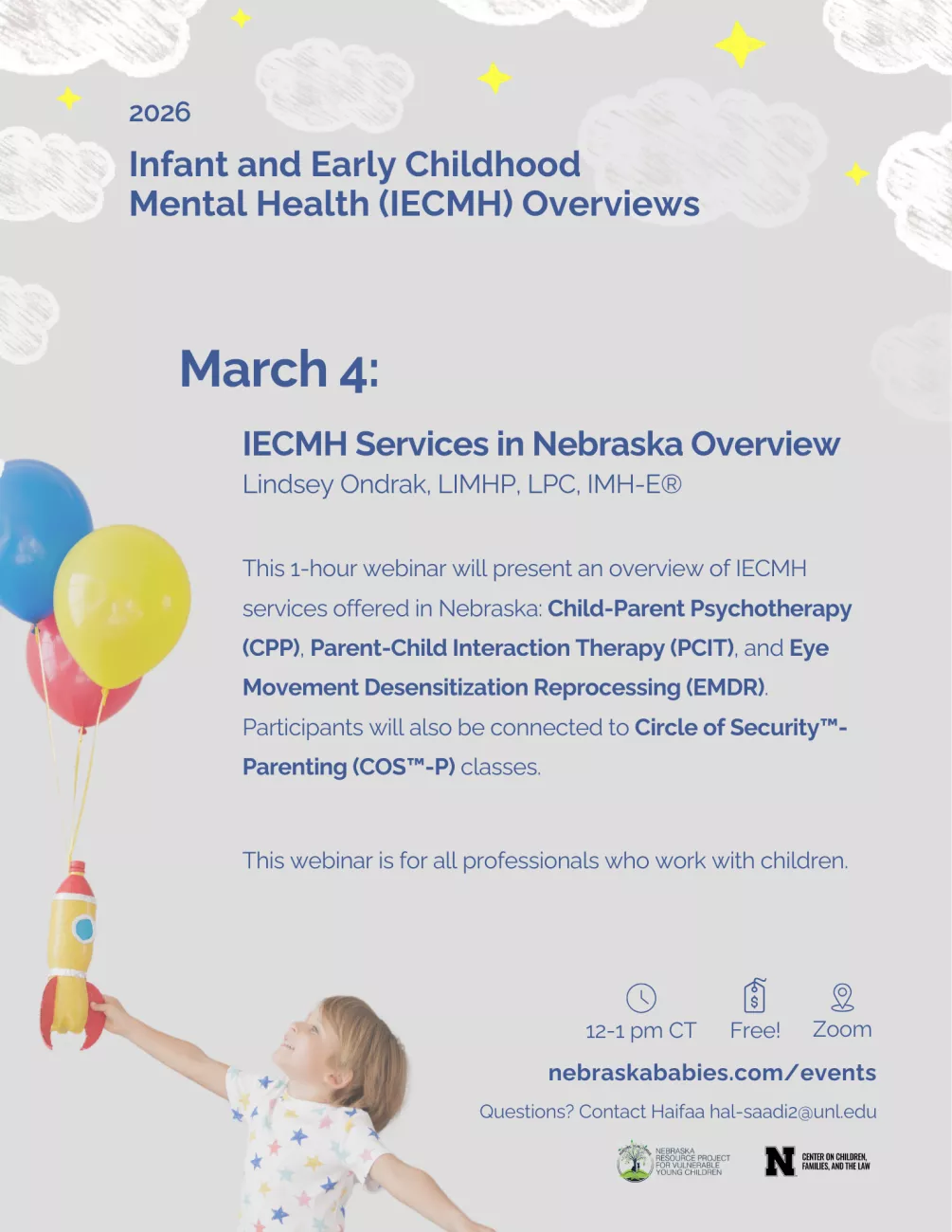 This FREE overview will familiarize you with three clinical services for young children in Nebraska available in Nebraska: Child-Parent Psychotherapy (CPP), Parent-Child Interaction Therapy (PCIT), and Eye Movement Desensitization Reprocessing (EMDR). This webinar will help attendees gain a basic understanding of how these services help children and families and how to refer to trained providers.